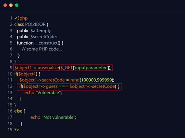 The following example demonstrates the PHP class ‘POI2IDOR’ with an exploitable ‘unserialize()’ method. In line 9 of the code snippet below, we observe that the data from the ‘inputparameter’ is deserialized in an unsecured way, which is then given to an ‘if’ conditional statement on line 12 that is subject to Type Juggling. When a specifically designed serialized object is supplied in this example, an attacker might be able to obtain an object reference for accomplishing an authentication bypass, for example, by accessing the following URL: