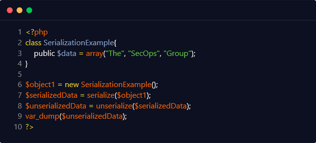 O:20:”SerializationExample”:1:{s:4:”data”;a:3:{i:0;s:3:”The”;i:1;s:6:”SecOps”;i:2;s:5:”Group”;}}