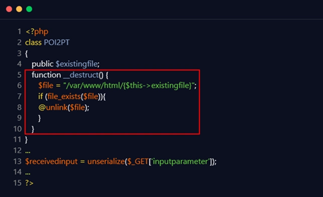 As seen in the following example, the PHP class ‘POI2CI’ includes an exploitable ‘__destruct()’ magic method from line 7 to line 9. When a precisely configured serialized object is supplied in this code snippet, the application will seek references to the ‘receivedinput’ object, and once there are no more references, the ‘__destruct()’ magic method will be called, resulting in the execution of the injected command.