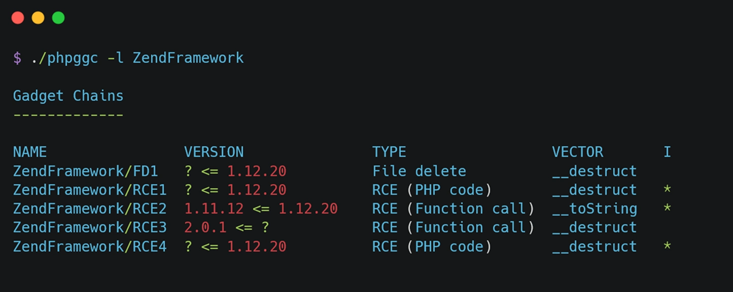 At the time of writing, the PHPGGC library has 94 gadget chains associated with various frameworks and libraries that it could exploit. The list of available gadget chains in PHPGGC can be obtained by executing the below-mentioned command: