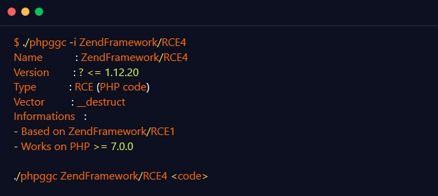 PHPGGC provides a ‘-i’ flag that can be used to retrieve additional information about the specified gadget chain using the command below:
