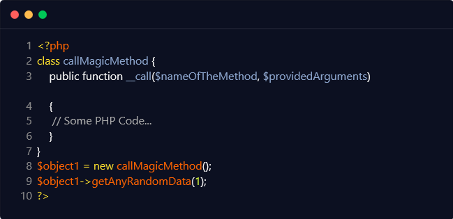 The below-mentioned code snippet utilizes the ‘getAnyRandomData’ method, which is not declared anywhere in the above code snippet, and therefore the ‘__call()’ magic method is invoked.