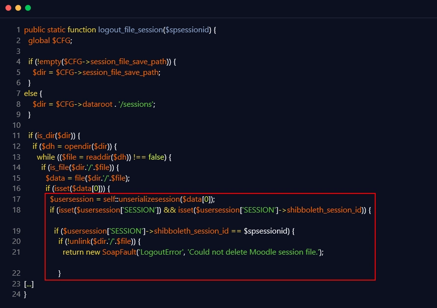 In this scenario, the researcher discovered that Moodle’s Shibboleth authentication module was vulnerable to Remote Code Execution through a PHP Object Injection vulnerability. The vulnerability was discovered in the logout handler in the ‘logout_file_session’ function spanning from line 17 to line 22, since the file handler traverses all session files. Each session file holds a single serialized session object. The handler handles this by reading each file and deserializing its data using the ‘unserializesession’ function. When a matching session ID in a session object is identified, the relevant file is unlinked, resulting in a ‘logged-out’ session, as shown in the below-mentioned code snippet: