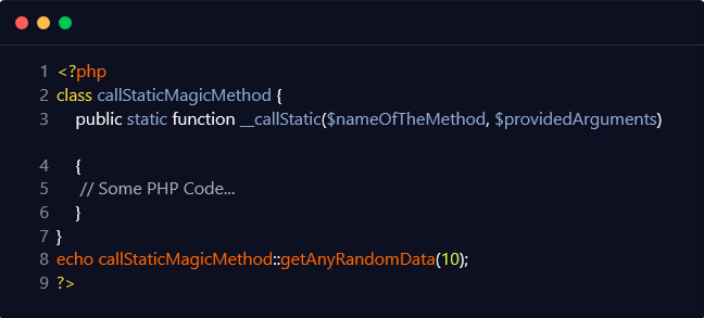 The below-mentioned code snippet utilizes the ‘getAnyRandomData’ static method, which is not declared anywhere in the above code snippet, and therefore the ‘__callStatic()’ magic method is invoked.
