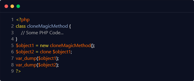 The below-mentioned code snippet utilizes the ‘clone’ keyword as a result of which PHP invokes the ‘__clone()’ magic method.