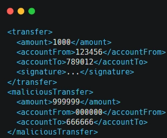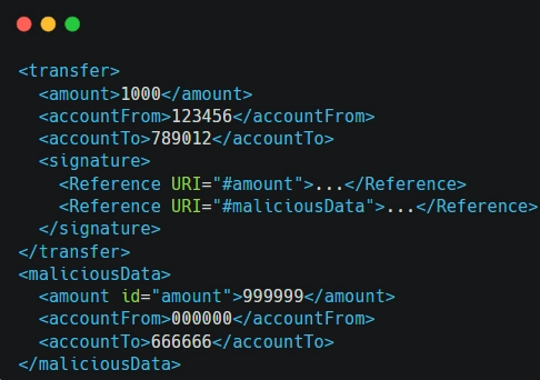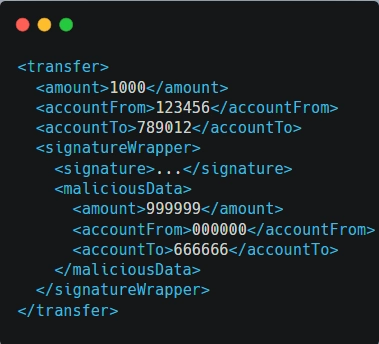 In this manipulated version, the attacker adds a new “maliciousTransfer” element with altered transaction details but retains the original signature. If the system fails to properly validate the entire XML structure or doesn’t detect the extraneous “maliciousTransfer” element, it might process the unauthorized transfer specified in the malicious data.
